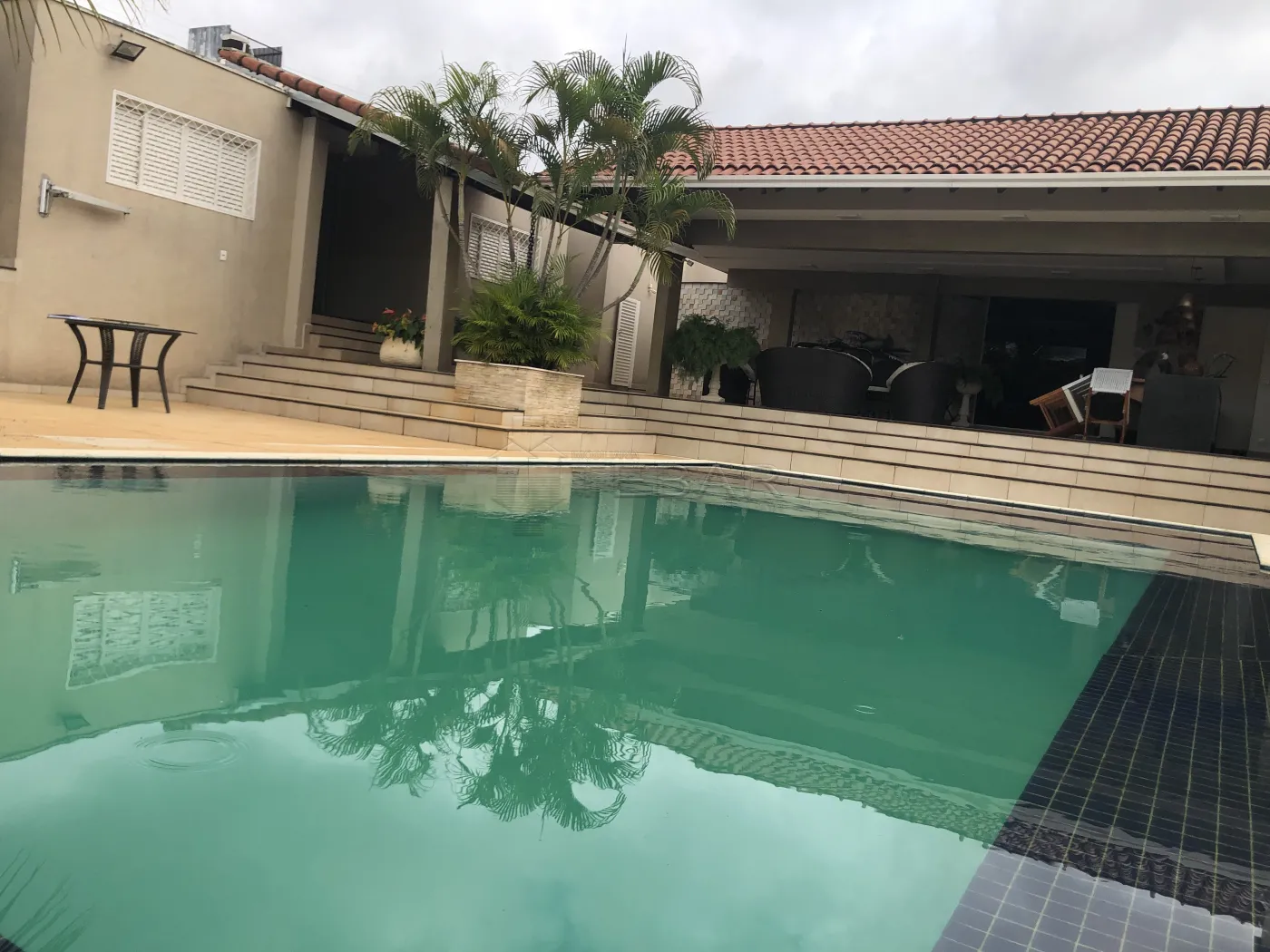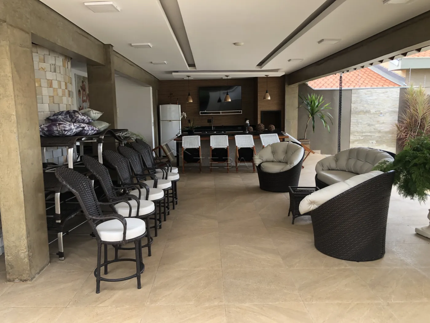 Área externa com quintal grande, duas despensas, lavanderia, piscina ampla, sauna, dois banheiros de apoio, varanda e área gourmet com churrasqueira. Anexo à área gourmet, há dois dormitórios com suíte e ar-condicionado. Garagem para quatro carros.